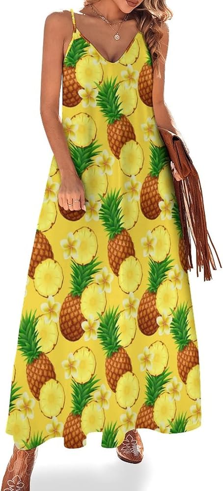 Pineapple Pattern Womens Casual Strappy V Neck Sleeveless Loose Long Maxi Beach Dress Sundress,M at Amazon Women's Clothing store