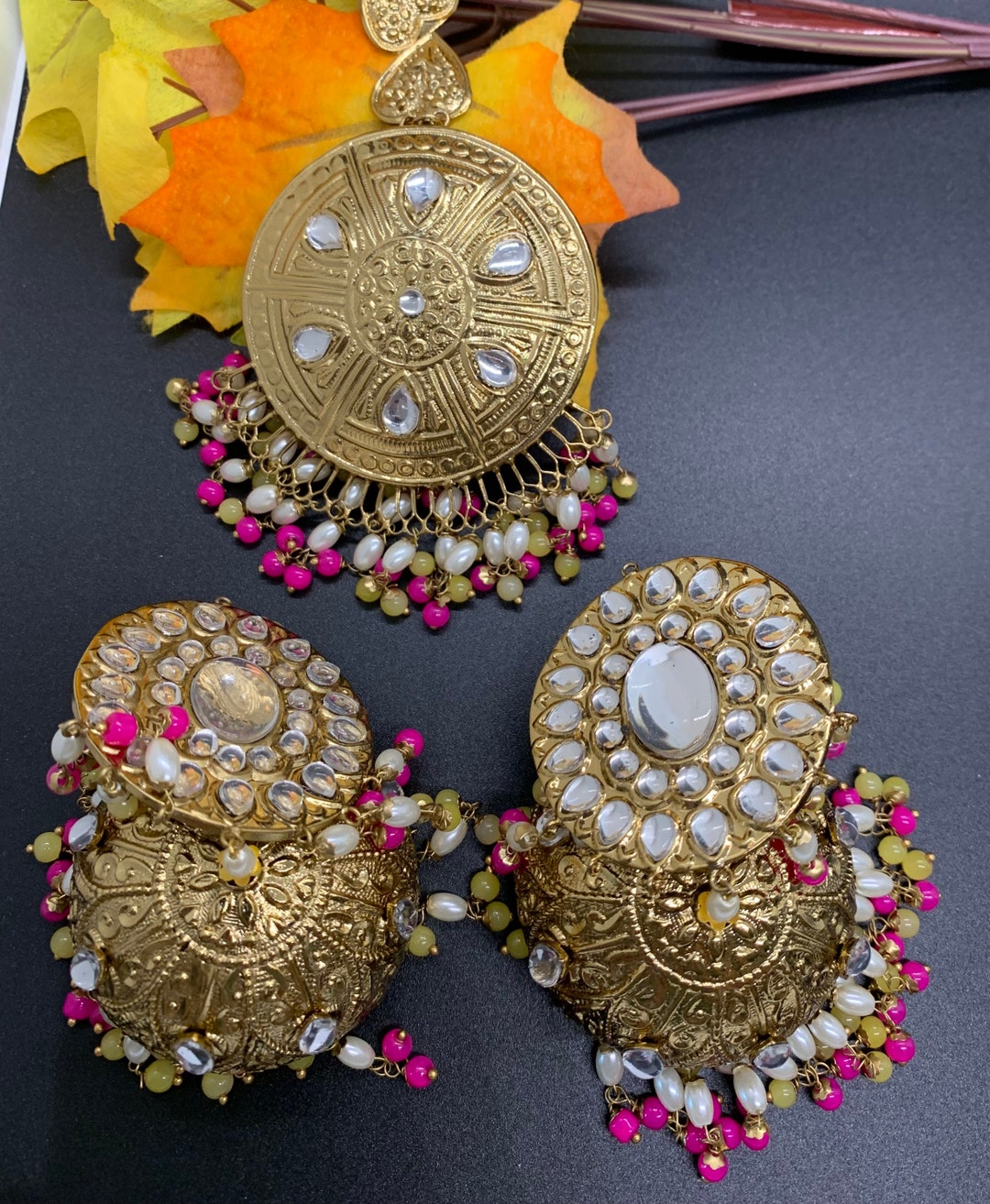 brass Goldfinish jadau traditional Punjabi kundan pipal patti pearl tika set With chandbaali