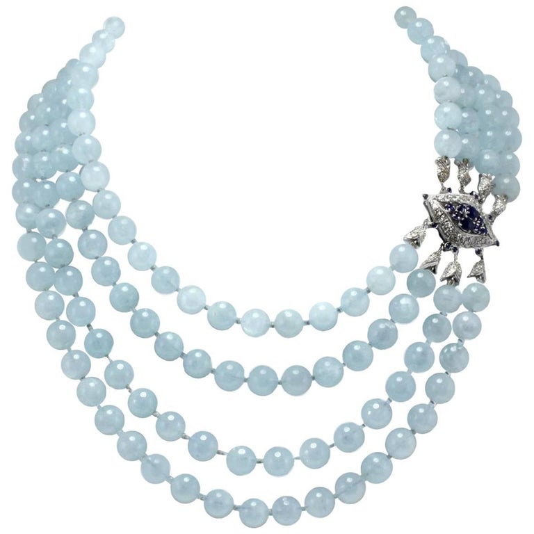Luise Aquamarine Beads Diamonds and Blue Sapphire Clasp White Gold Necklace For Sale at 1stDibs