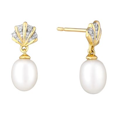 9ct Yellow Gold Pearl And Diamond Fan Drop Earrings | H.Samuel